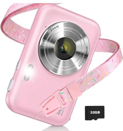 Digital Camera with Neck Lanyard, FHD 1080P Kids Camera, 32GB Card, Anti-Shake 16X Digital Zoom, 44MP Point Shoot Cameras, Compact Portable Small Gift Camera for Kid Teen Student Girl Boy(Pink)