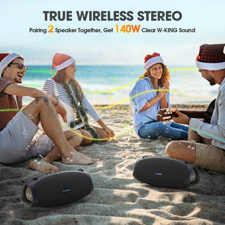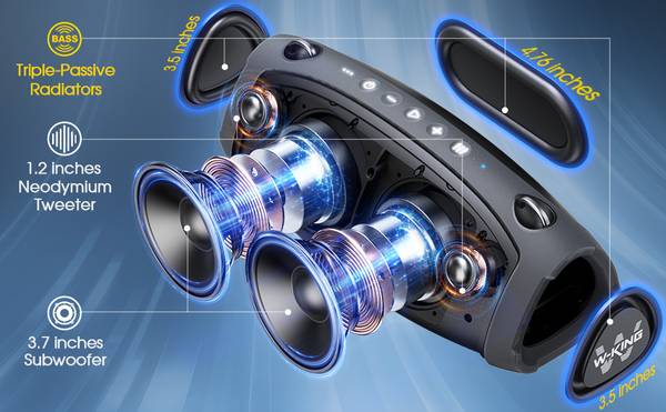70W RMS (120W PEAK) POWERFUL DEEP BASS- W-KING X10 Loud Bluetooth Speaker is the first on the market with triple passive radiators (2 * 3.5" side and 4.76" back), which can provide a deep bass experience unmatched by other Bluetooth speakers. The outdoor portable speakers Bluetooth wireless also equipped with 2*35W subwoofer, 2*10W tweeters and advanced DSP chip to achieve clearer mid-highs, rich and smooth zero-distortion sound, and high-frequency sound up to 40kHz is significantly clearer.