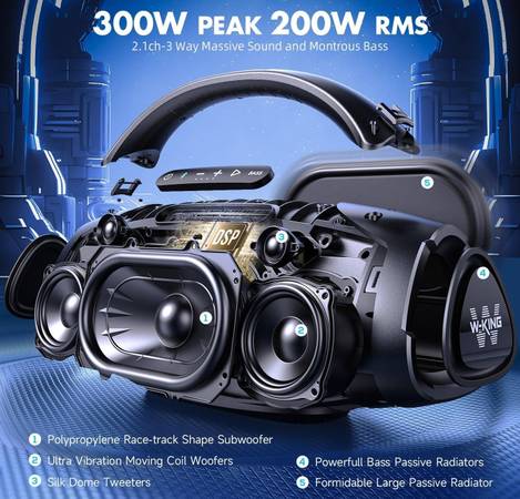 W-KING X20 300W Peak 200W RMS Portable Bluetooth Speaker, Massive Bass Party Boombox, IPX7 Waterproof Bluetooth Large Outdoor Speaker with APP Control, 5 Drivers Formed 3-Way System, Loud Wireless Speaker/V5.3/EQ APP/Fast Charge/Stereo Pair/Guitar in, Dimensions: 8"D x 19"W x 10"H, Weight: 23 pounds, List Price: $299.99 + $26 tax