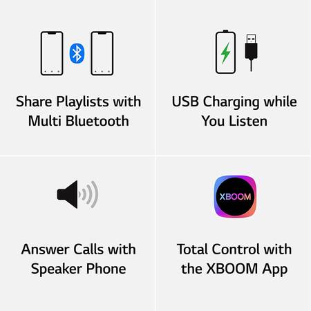 Keep the party going. The portable LG XBOOM Go speaker features long-lasting battery life*** and easy USB Type-C charging—so you never run out of juice and the party never has to stop.