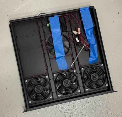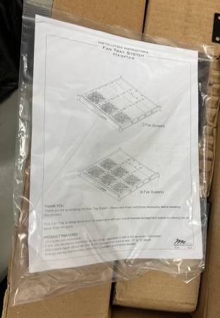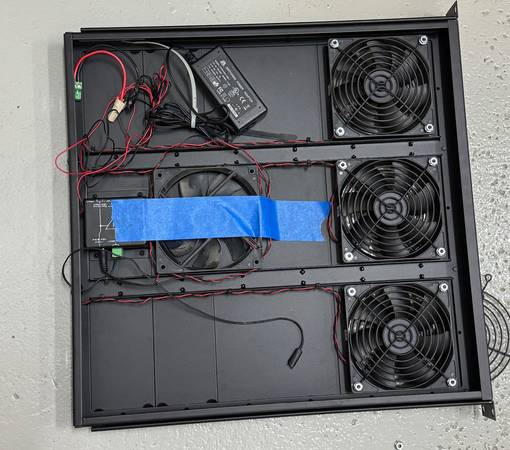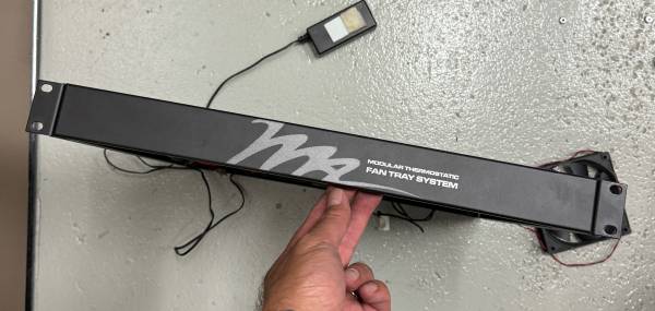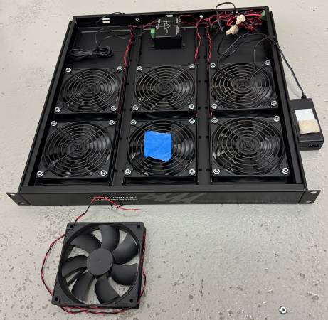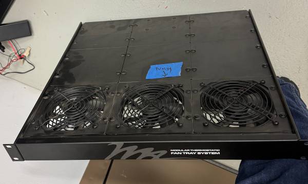 Middle Atlantic rack fan trays for sale, this set includes two FTA-3 3-fan trays and one FTA-6 6 fan tray, all used, $200 for all 3. Each comes with a used extra fan. One fan on one FTA-3 marked with blue tape and one fan on the FTA-6 again marked with blue tape are a little noisy, but since you get 3 extra used fans it is easy to swap. The trays are a little dusty as I currently unfortunately I do not have compressed air available. The thermostatic controls have been bypassed on all 3 units for continuous operation, but all parts are there to reconnect them if desired. Come with manual and rear rack supports.