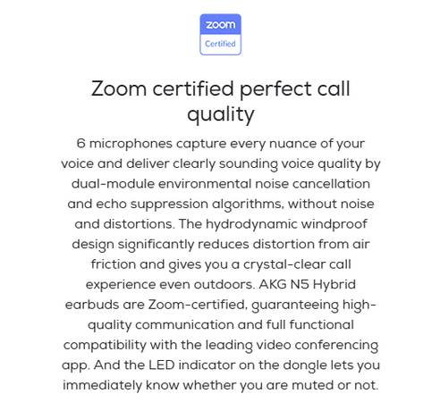 6 microphones capture every nuance of your voice and deliver clearly sounding voice quality by dual-module environmental noise cancellation and echo suppression algorithms, without noise and distortions. The hydrodynamic windproof design significantly reduces distortion from air friction and gives you a crystal-clear call experience even outdoors. AKG N5 Hybrid earbuds are Zoom-certified, guaranteeing high-quality communication and full functional compatibility with the leading video conferencing app. And the LED indicator on the dongle lets you immediately know whether you are muted or not