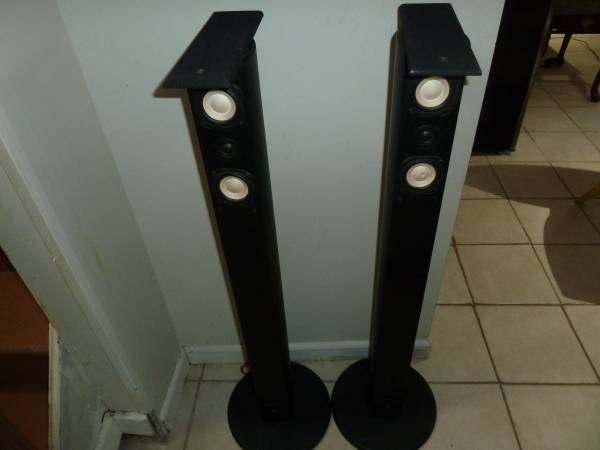 These speakers are slim with a disc base.Make good sound Sony speakers 40 watts. Tested and working Small depression in cone (see right spk)does not affect functonality. Grills are slack,they fall...