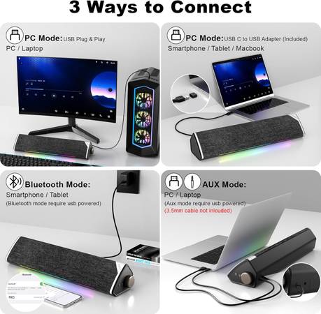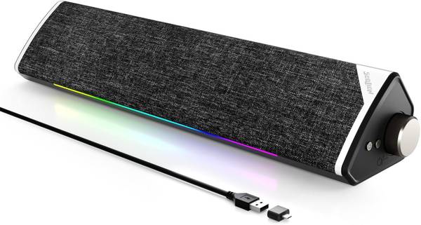 SOULION R60 Bluetooth Computer Speaker, USB Plug-N-Play PC Speaker with LED Dynamic Light, Surround Sound Soundbar Speaker with Rotary Switch for Desktop Laptop, USB-C to USB Adapter Included, Black