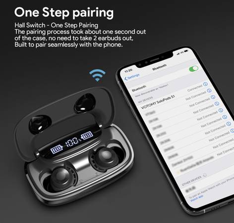 Expertly-Tuned Sound: This Votomy true wireless earbuds have a size 6mm drivers with double-layer composite diaphragms to produce powerful sound with 60% more bass, 40% more treble, and clear mids. Support SBC/AAC high-quality audio decoding, providing you with pure, lossless and shocking sound quality! Intelligent sound control, protect your hearing!
