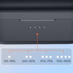 The case fully charges the earbuds 5 times. Battery level indicator shows remaining battery.