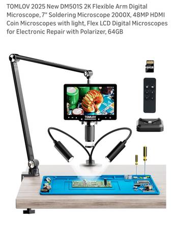 Flexible Arm Digital Microscope: TOMLOV DM501S features a 3-axis and 360° rotating flexible arm for customizable observation angles. Ideal for soldering and capturing full coin views, it provides ample space and the best observation angle