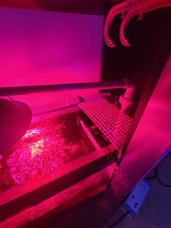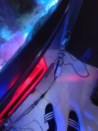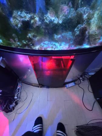 Reef ready 90 gallon bowfront tank with 30 gallon hexagon shape sump tank stand and matching hood only thing wrong is the front door doesn't fully close see pics you will need a new pump bc the 1 on it is dying i made this listing for an ebay customer specifically but anyone can come buy it - today is November 4 2025 the sooner the better no livestock or rocks i will put everything into my other tanks