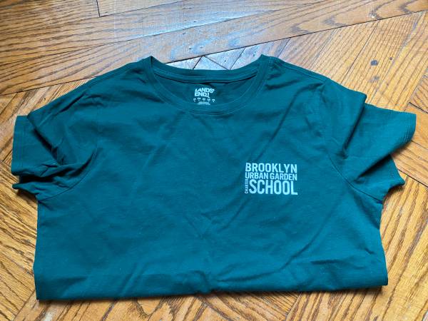 New dark evergreen uniform T-shirt with BUGS logo Women's S, feminine fit Measures 19.5 across chest (armpit to armpit)