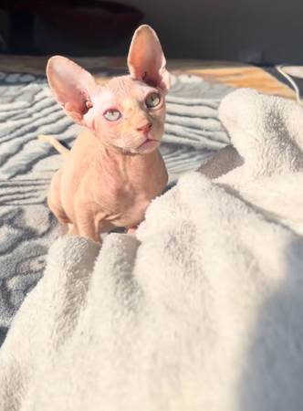 2 month old girl sphynx kitten shes just turned 2 months old her birthday is on aug 11th she very sweet and a very clingy kitten shes super cuddly aswell she very sweet with other cats and she adjusted quickly shes is up to date with her vaccine and is dewormed and eats hard and wet food she drinks water aswell she litter trained aswell she very outgoing and energetic