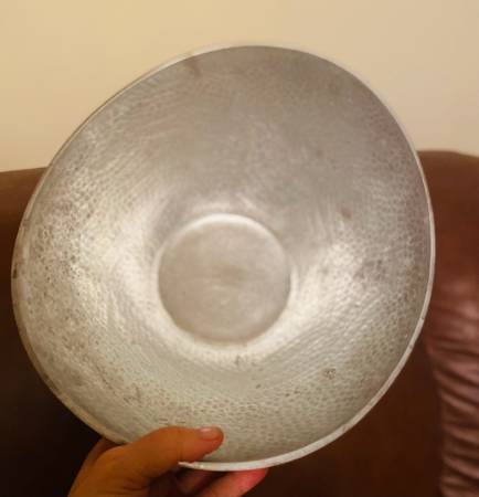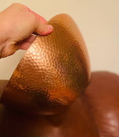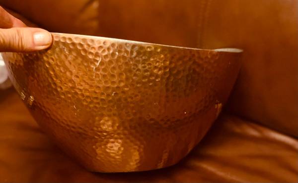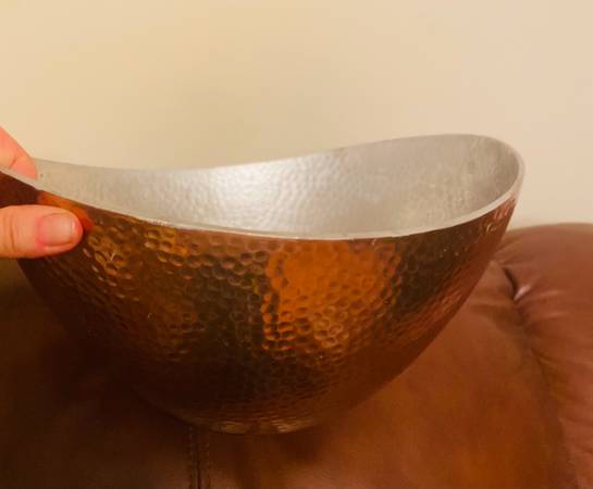 Selling a lovely hammered copper bowl! It has a unique textured surface and a beautiful copper color on the outside with a silver interior. It's in great condition and would make a stylish addition...