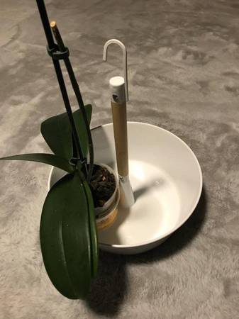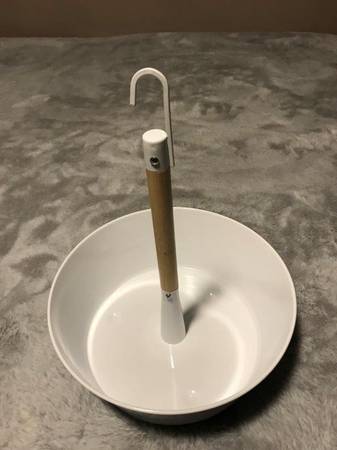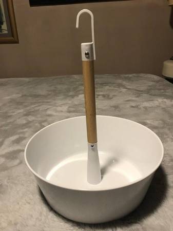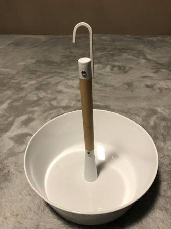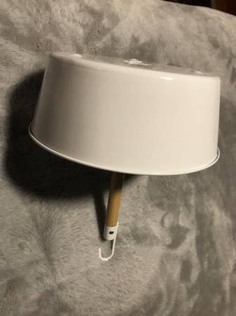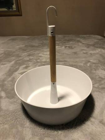 Brand New Ikea white metal "Bittergurka" Hanging planter with wooden dowel, the white metal base measures: 11 1/2"Diameter x 4 1/4"Height, wooden dowel with white metal hook measures: 10"Height....