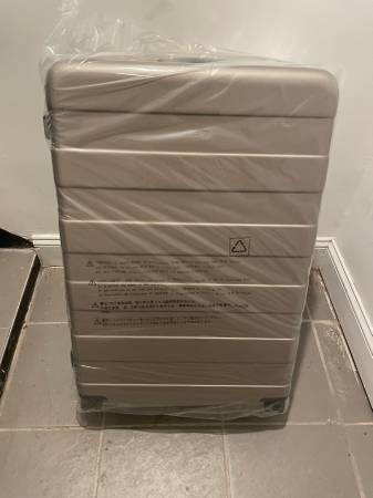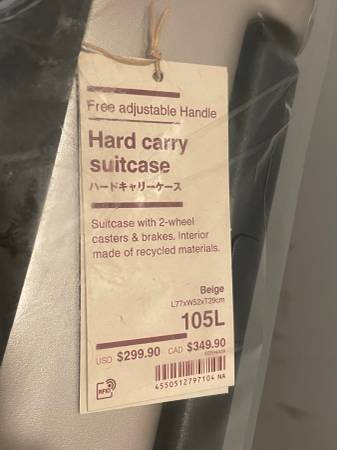 Brand new, never opened MUJI Hard Carry Suitcase. 105 Liters, 2-wheel casters & brakes, adjustable handle, built-in TSA lock, made of recycled materials. Retails at MUJI for $299 (https://www.muji.us/products/adjustable-handle-hard-shell-suitcase-105l-check-in-eee47a5a?variant=45330018664638).