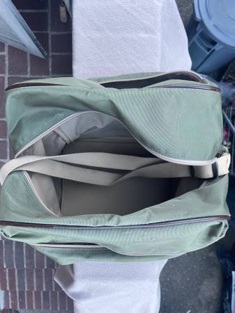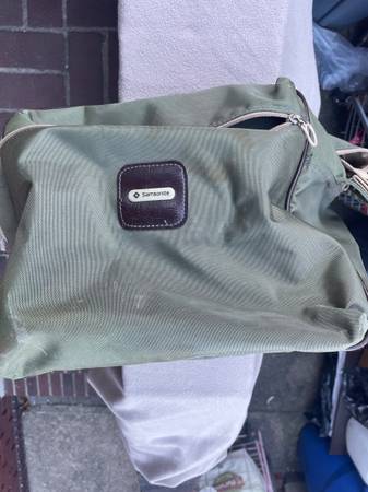 Green vinyl Samsonite shoulder bag Good condition One large center zippered center compartment plus two zippered end pockets About 9" x 12" x 16"