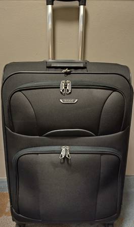 used once spinner trolley luggage pullman with side and telescopic handles , padded shoulder strap , carry handle and three large horizontally-aligned wheels measuring thirty inches high, nineteen...