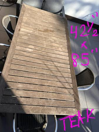 Is teak . Gonna say good plus..This table last a lifetime.85” x 42” Minor imperfections.. Also have new bottles of teak cleaner n stain.. Will bring out a gray color… There will be a reasonable...