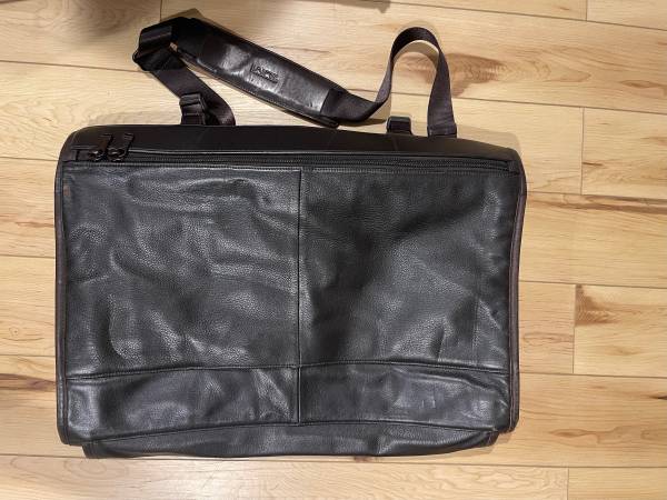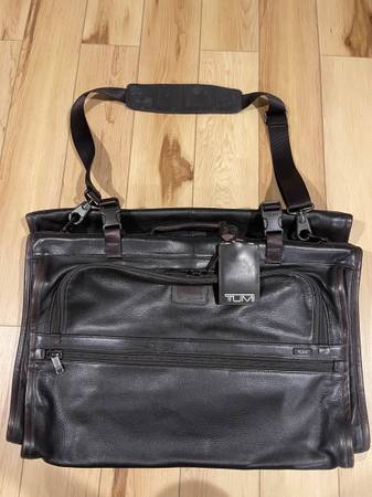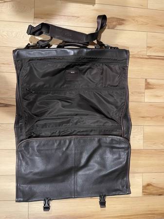 Tumi leather suit bag carrier. Briefly used, then put in storage in a non-smoking, pet-free home. In very good condition. The leather is supple, shiny, and does not have any tears. Lots of storage and compartments. See photos.