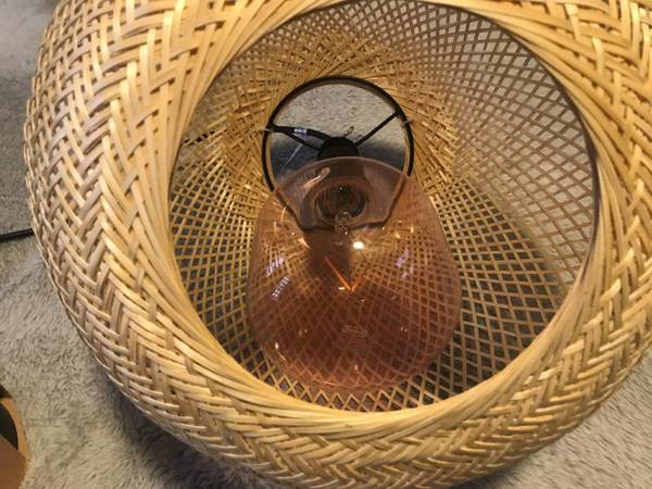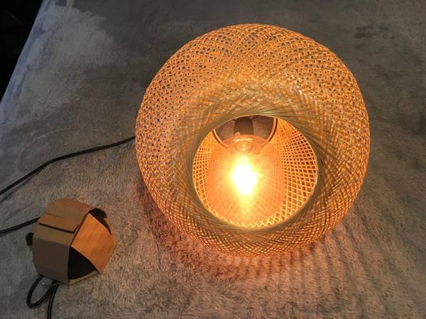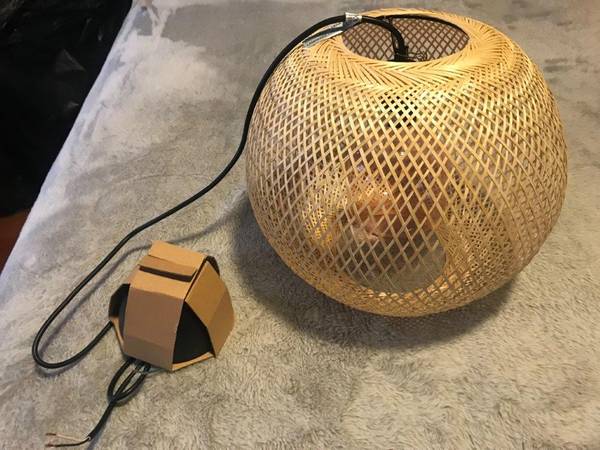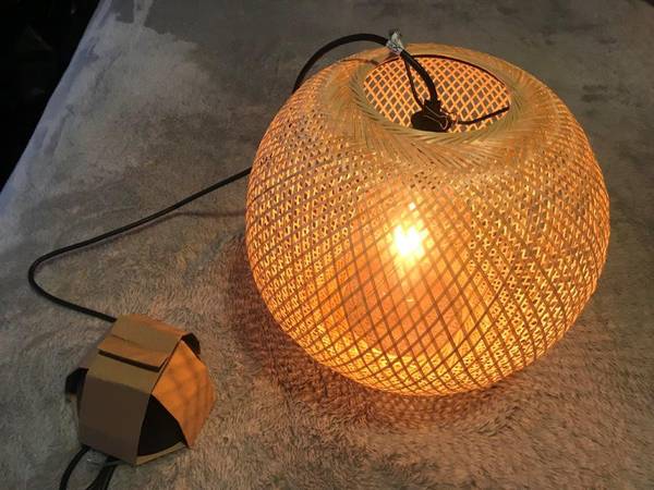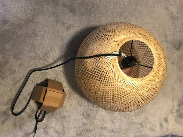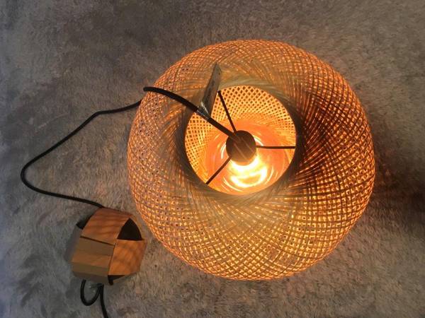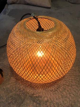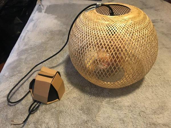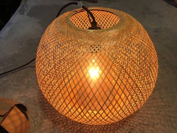 Brand New "Vindoga" handmade Bamboo Pendant lamp, this lamp shade gives a glowing light that creates a warm atmosphere , great anywhere in your home, measures: 14"Diameter x 12" Height, Cord length 5'3", shade : Bamboo, clear lacquer. [Hardwired installation]. Light bulb included, Great Deal $69.99Retail, Firm on the price.