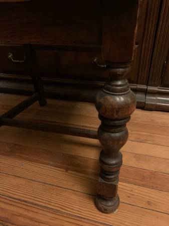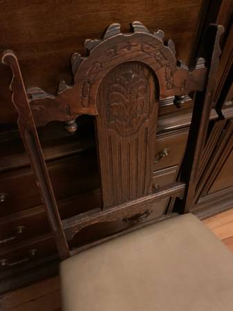 The chair with arms has a rip on the seat but you’d likely want to redo the material as these were redone with pleather-like material years ago to withstand kids but you can easily pop off the seats and reupholster with something more fitting of their style.