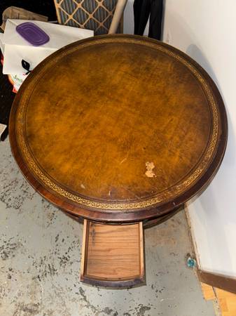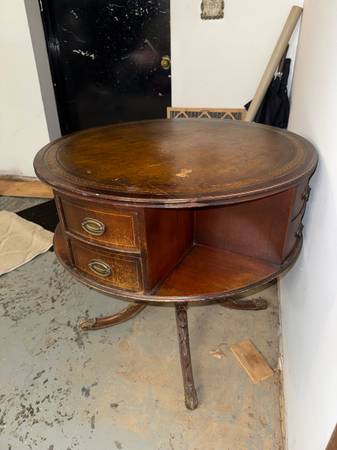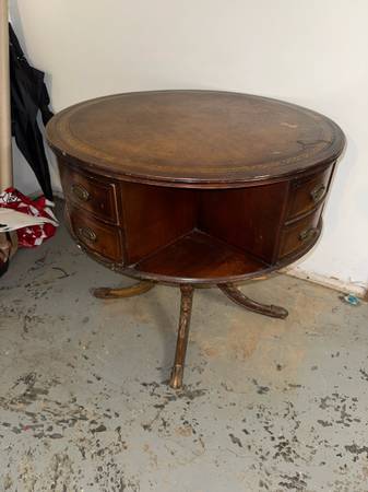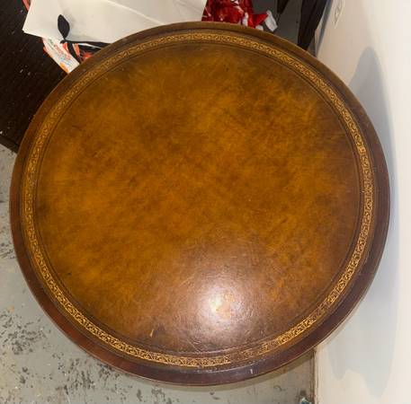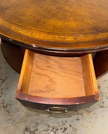 Experience the elegance of the Regency era with this exquisite mahogany drum table. The rich, deep patina of the wood is complemented by the luxurious tooled leather accents, creating a piece that is both functional and a work of art. Measuring at 29 inches in height, 36 inches in length, and 36 inches in width, this table is perfectly sized for a statement piece in any living space. With its timeless design and exceptional craftsmanship, this antique table is a testament to the grandeur of the Regency style and is sure to be a cherished addition to any collection.