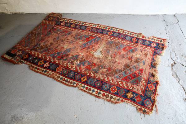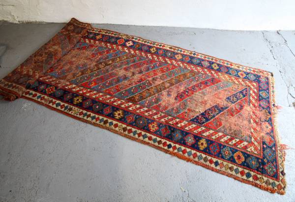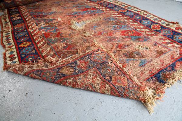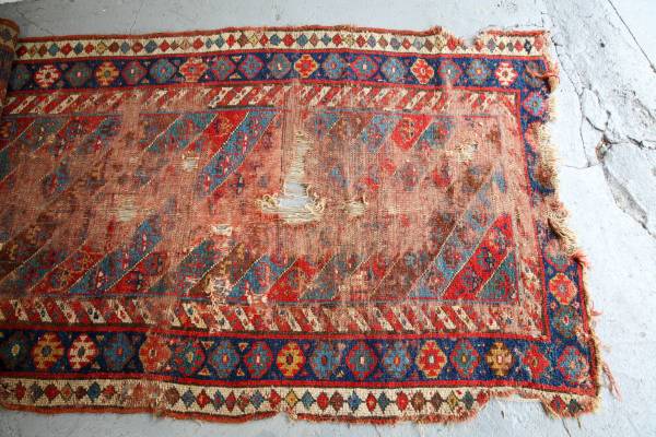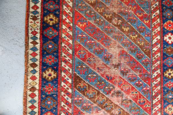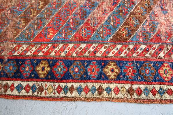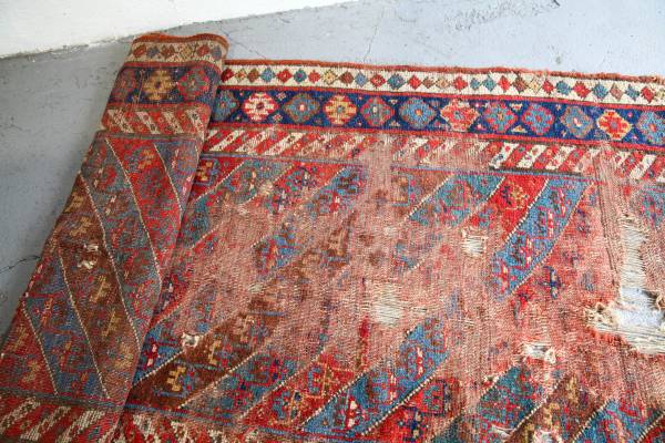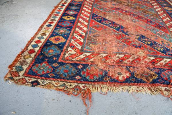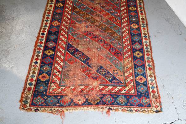 Vintage / antique hand knotted rug from the Caucacus with geometric patterns in red and blue. Eleven feet long - would work as a wide hallway runner, in an entry way or in a living space. In worn condition - loss to fringe and edges; some areas worn through or nearly through; this rug has seen a lot of use and love (and probably parties!) but also has a ton of character. See pictures for details of wear.