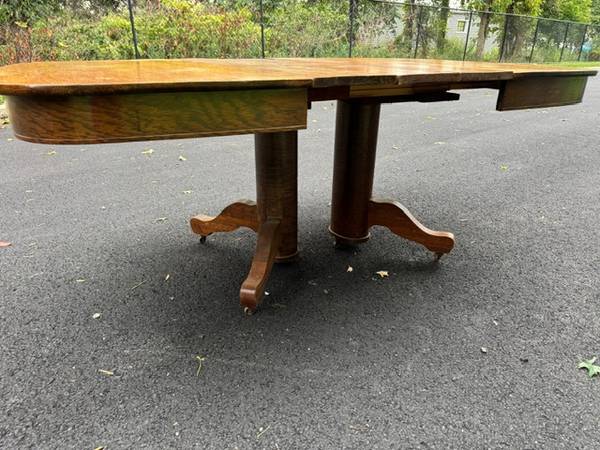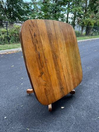 Antique 48” square expanding tilt top oak dining table is in good shape. This is made of solid oak and can be sanded and refinish or used as is. This unique table flips up for easy storage and has a double pedestal. The table has casters that roll easily and has three leaves to expand. The table measures 48"square x 30"h with three leaves measuring 9 inches seven and three-quarter inches and seven and three-quarter inches wide. measures 72.5” long with all leaves. This opens to 80” wide if wanted to add another leaf and have it made to match.