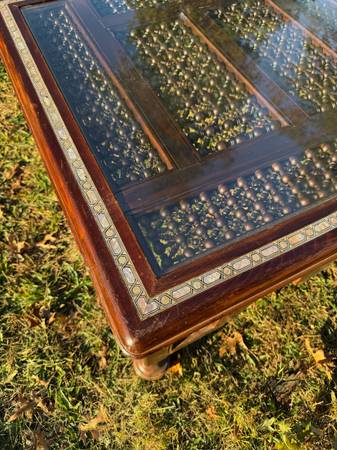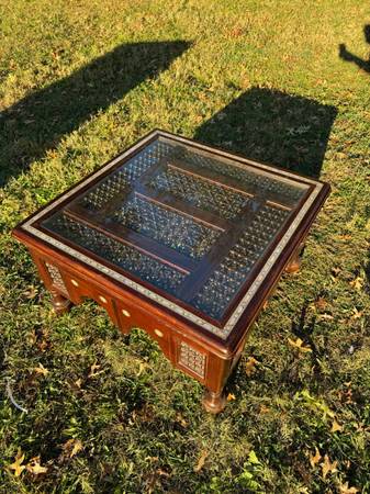 Antique Early 20th-Century Moroccan Mother-Of-Pearl Inlaid coffee table is in great shape. This gorgeous coffee table shows all the bells and whistles with carved wood and detailed inlays. The glass top comes off for easy moving and cleaning. This measures 31” square x 18” tall.
