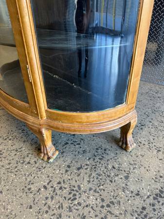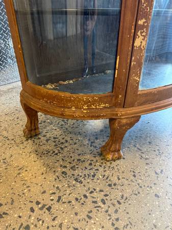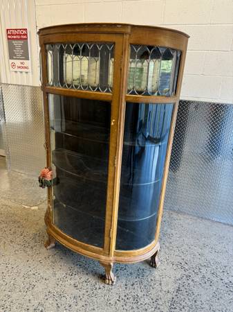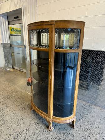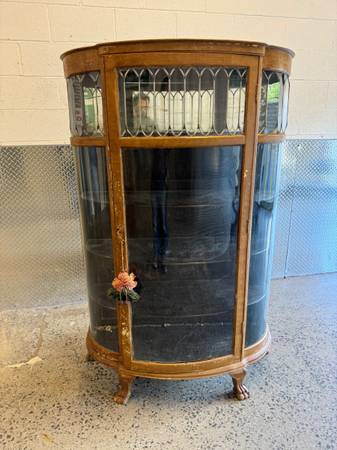 Antique Leaded curved glass oak bookcase curio cabinet is in good shape. This has been painted and can be used as is or have it stripped and stained or a new coat of paint. This measures 41” wide 17” deep 65” tall with the shelf space 13”,10”,10”,10”,10” from top to bottom.
