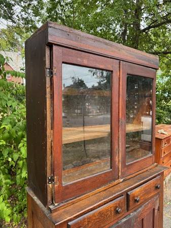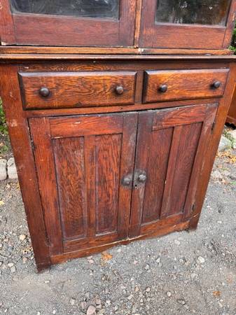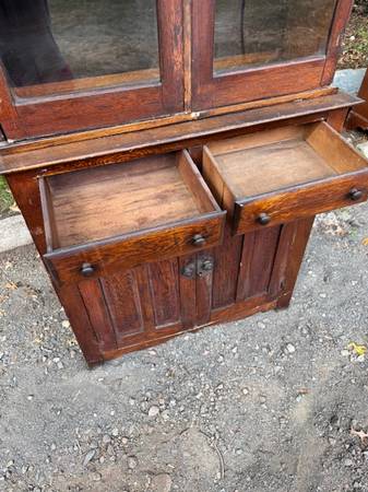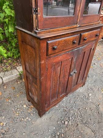 Antique solid oak 2 piece bookcase cabinet is in good shape. This is made of solid oak and can be stripped and refinished to match any decor. The top is missing its crown molding and you can add more shelving on the inside. The top is removable for easy moving. The bottom cabinet measures 40 inches wide 16 inches deep 42 inches tall doors are 16 inches wide 29 inches tall two drawers measure 15 inches wide by 4 inch inches deep. Top measures 38 inches wide 13 inches deep 34 inches tall overall height at 76 inches. Glass doors are 18 inches wide by 30 inches tall.