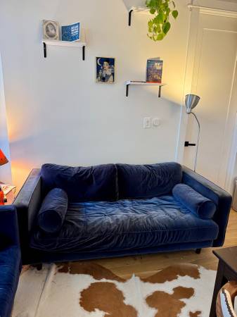 Beautiful navy velvet couch from Article — super comfortable and in great shape overall. The main cushion zipper doesn’t work but it’s not noticeable, and there’s some light wear from cats (mainly on the arms) that blends in with the fabric. It still looks really nice and plush.