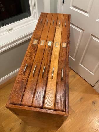 It is in good used shape and works well but has some scratches and wear which is to be expected for a piece of wood furniture this old.