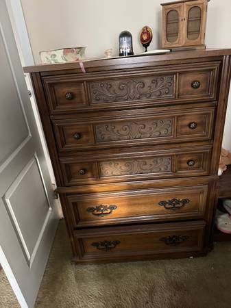Bed, one night table, Dresser, Chest. Bed: Queen size Night Table: 25" Long X 23" High X 15 Deep Dresser: 66" long X 30" H X 17"deep Chest: 36" wide X 48" High X 17 deep