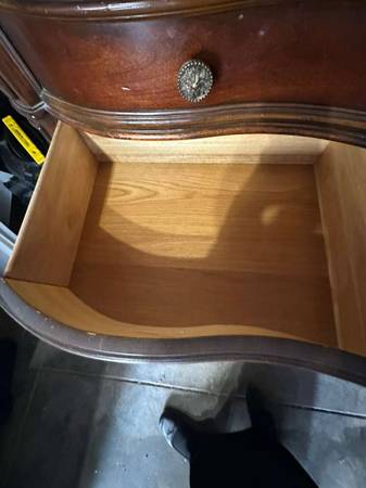 The dresser’s bow-front drawers glide easily, adorned with antique brass pulls that highlight its vintage elegance.
