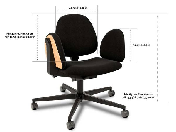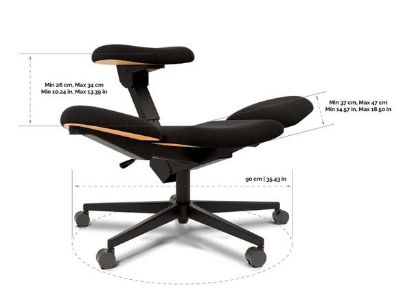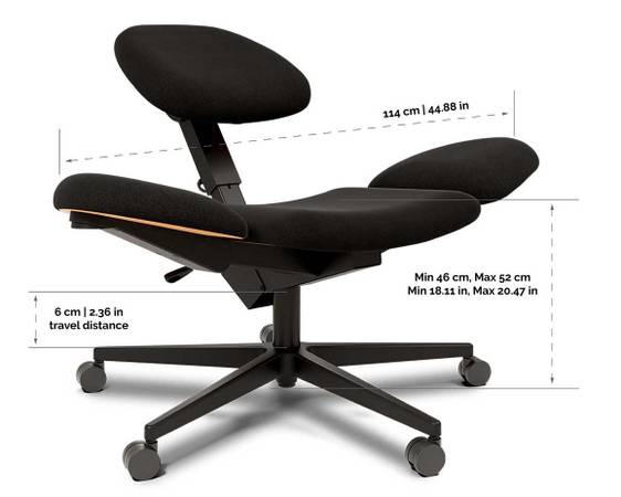 This was the ergonomic office chair everyone wanted because it allowed you to sit on multiple positions. Have had it 2 years and, while it's in great shape, it isn't ergonomic in the right ways for me. More of a fun living room chair if you have lots of space, which I don't. You will need a way to haul it: it's around 68 pounds, and the base is large. Black fabric, natural finish, feet and wheels. See pix for look and dimensions. It's retailing for over $700 on Wayfair.