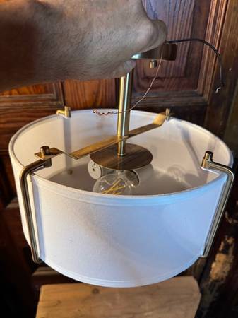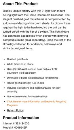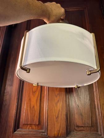 Brushed gold and fabric drum shade flush mount ceiling light is in good shape. This will add a touch of modern to any space. This measures 13” diameter 11” tall.