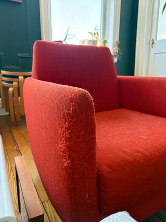 FREE CB2 Parlour Armchair in Blood Orange with some cat damage pictured. This is a great, comfortable armchair. Could be a fun upholstery project. Pickup at Union and Columbia St. in Brooklyn. I can...
