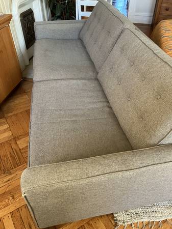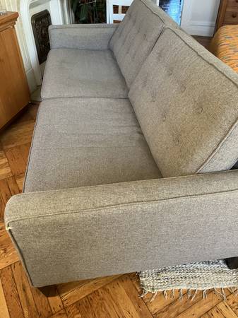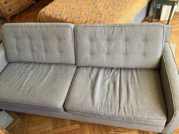 Dark grey fabric couch. Used but in good condition with many years left. Some very light discoloration on cushions that would probably come out with cleaning.