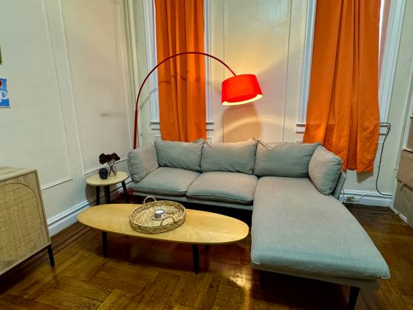 *Floyd L-Shaped Couch (originally $2,475) - Still in great condition, comfortable, and stylish. The chaise can be configured to be on either the left or right side. Cushions just professionally cleaned! (Note: I have cats, but the couch was always covered with a sheet for protection - no damage or scratching). No smoking in the household. No sagging. No butt dents. Dimensions: Width: 87 inches, Height: 32 inches, Depth: 61 inches