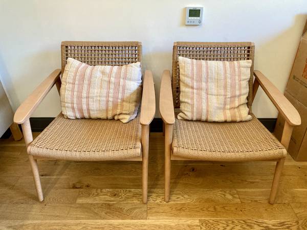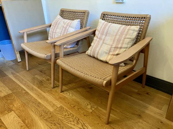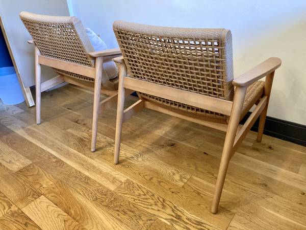 From the website: Our take on classic Danish mid-century design, Coronado reimagines the style's clean lines and solid wood construction with comfort-driven details. Sloped arms are pitched at just the right angle for restful draping, and the curved, rattan-covered seat and back are contoured to conform to the body. Woven by hand out of seagrass, the rattan gives the chair a breezy look while providing an open view of the well-crafted wood frame. The Coronado wood and rattan accent chair is a Crate & Barrel exclusive.