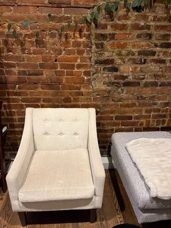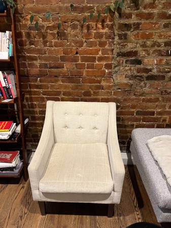 Cream colored comfy arm chair. Great for cuddling up with a book. We love it but it no longer fits with our new couch!