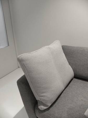 2. Light gray textured, and a feather cushion inside, 24 inches each side. Has a small flaw at bottom back (pictured). $10