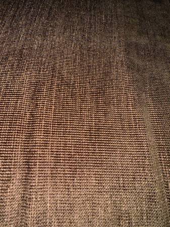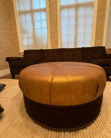 Custom oversized round ottoman in warm brown tones, firm and spacious for lounging or extra seating.