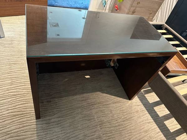 Custom walnut vanity table with a thick, tempered glass top sitting flush against the dark wood. The walnut finish is deep and smooth The table’s structure is boxy and clean, Located in Brooklyn, NY...