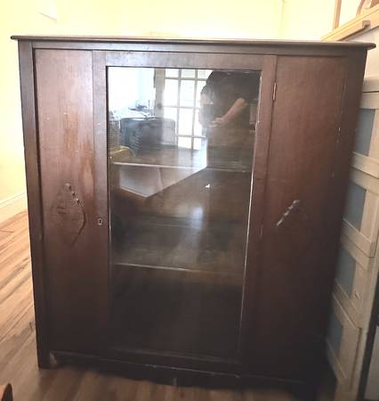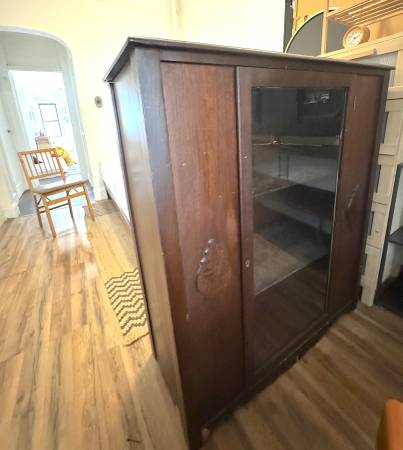 Real Wood, 3 Shelves, glass front. This has been used as a liquor cabinet, a hutch, storage for art supplies, and a unit for clothes. It's loved and has scratches and chips- see pics.