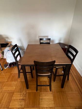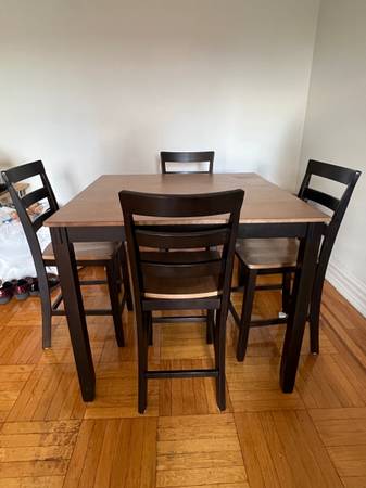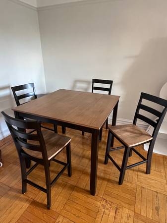 New dining room set, originally purchased from Jordan’s Furniture. Includes wood table and four barstool-height chairs with backs. Table is 36 inches tall, with 42” x 42” W and D. Open to offers.