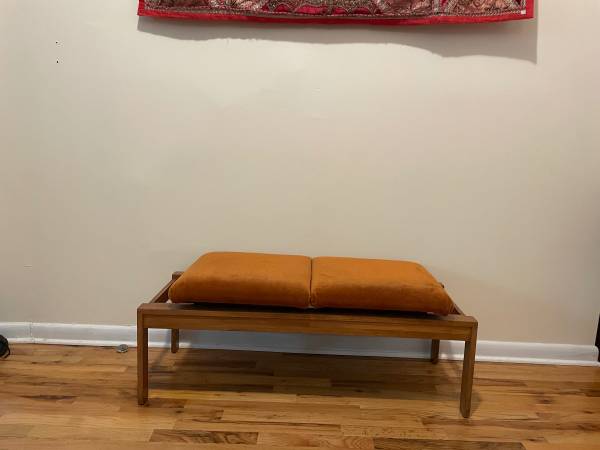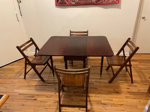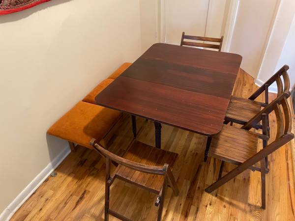 Includes 1 foldable wooden table (has a small drawer), 4 wooden chairs, and 1 MCM modular bench.