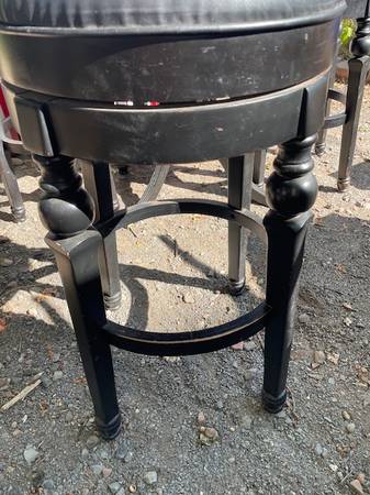 Distressed Solid wood black finished bar height table and four chairs is in good shape. This set can be lightly sanded and touched up or repainted. The table measures 42”w x 42”h with the 4 swivel chairs 18”w x 44.5” back height x 30.5” seat height.