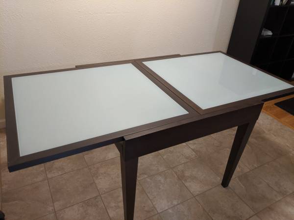 This Design Within Reach table is made of both glass and wood. Normally seats 4 in compact mode, and could seat 6-8 once expanded. Comes with 6 wood dining chairs (2 not pictured).