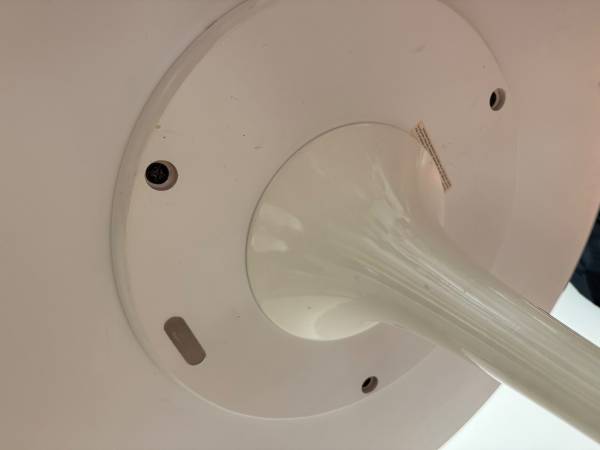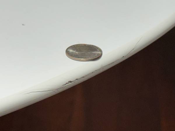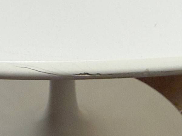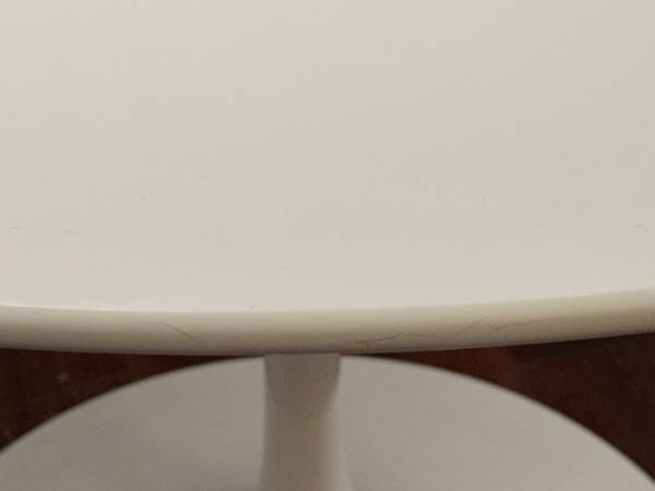 There is a bit of a crack in the side of the laminate on the edge of the table - it does not extend into the tabletop - just on the side. The movers were a bit rough with it when moving it into the apartment a few years ago. Otherwise the table is in great condition. See photos for condition including a photo of the crack in the laminate.