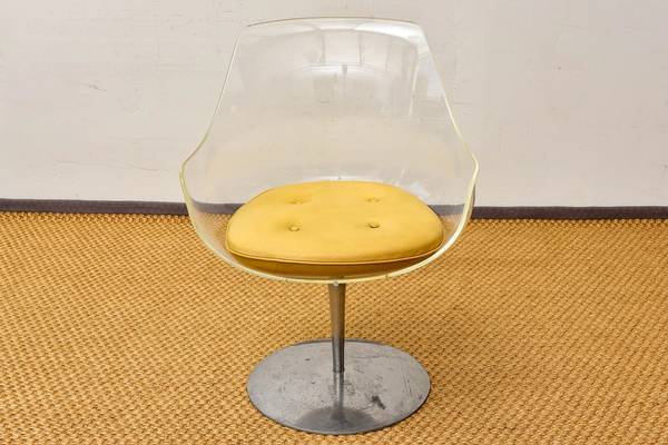 Organic shaped lucite shell with seat cushion on sprung auto return revolving aluminum base.